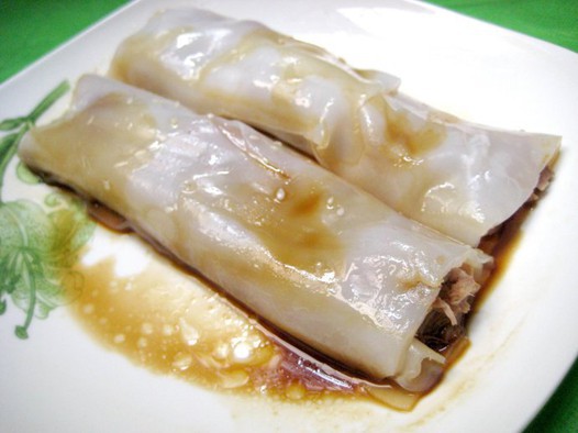 4.把陳村粉攤開,捲入叉燒粒